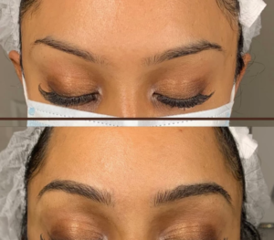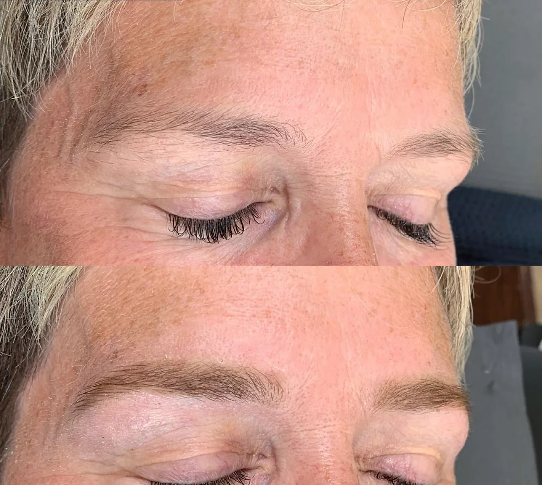 The actual process starts off by painting a lifting cream onto the brow, which creates a chemical process that breaks down bonds in each hair, allowing them to be moved into a new shape. Next, the brow hairs are brushed up into place and a neutralizer is applied to reform the bonds into their new shape. Then a nourishing oil is added to the brows to replenish their moisture after the chemical treatment process. Please note you can also add on tint with this treatment.
